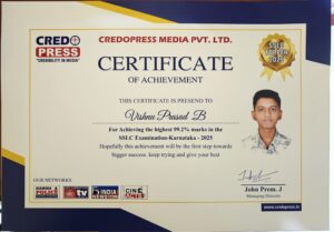 ವಿಷ್ಣು ಪ್ರಸಾದ್ ಬಿ ಅವರು ಎಸ್ಎಸ್ಎಲ್ಸಿ ಪರೀಕ್ಷೆಯಲ್ಲಿ ರಾಜ್ಯಕ್ಕೆ ಪ್ರಥಮ ಸ್ಥಾನ ಗಳಿಸುವ ಮೂಲಕ ತಮ್ಮ ಶಾಲೆ, ಕುಟುಂಬ ಮತ್ತು ಸಮುದಾಯಕ್ಕೆ ಅಪಾರ ಹೆಮ್ಮೆ ತಂದಿದ್ದಾರೆ. ಅವರ ಅಸಾಧಾರಣ ಶೈಕ್ಷಣಿಕ ಸಾಧನೆಯು ಅವರ ಸಮರ್ಪಣೆ, ಕಠಿಣ ಪರಿಶ್ರಮ ಮತ್ತು ಶೈಕ್ಷಣಿಕ ವರ್ಷದುದ್ದಕ್ಕೂ ಅವರು ತೋರಿದ ಸ್ಥಿರ ಪ್ರಯತ್ನವನ್ನು ಪ್ರತಿಬಿಂಬಿಸುತ್ತದೆ.
